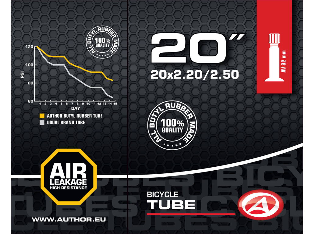 AUTHOR 20x2,20-2,50 vnútorná duša vyrobená zo 100 % butylovej gumy s veľmi nízkou priepustnosťou plynov. Udrží tlak vzduchu v pneumatike bicykla dlhšie ako duše zo syntetického kaučuku.