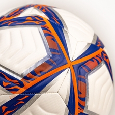 Moderný dizajn:: Lopta má svieži biely dizajn doplnený dynamickou modrou a oranžovou grafikou, ktorá jej dodáva moderný a športový vzhľad.
