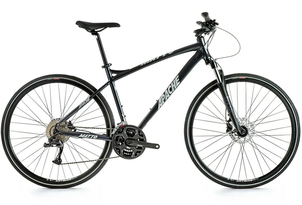 Apache Matto A1 je crossový bicykel s hliníkovým rámom, 28-palcovými kolesami, odpruženou vidlicou a pohonom 3x9.