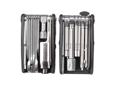 | Náradie: | Kľúče: 2-L / 2,5 / 3 / 4 / 5 / 6 / 8 / 10 mm inbusy, T25 Torx®, 8 / 9 / 10 mm kľúče, 14G / 15G / Mavic m7 / Shimano® stredové kľúče, nitovačka, hák na reťaz, ťažké montážne háky, krížové a ploché skrutkovače, delený nôž s pílkou, otvárač na fľaše, servisná vložka pre čeľuste kotúčových bŕzd |