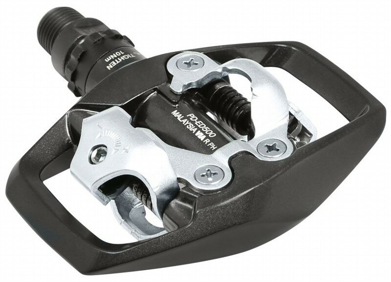 - ľahké obojstranné cestné pedále SHIMANO PD-ED500 s ochrannou klietkou Alu- obe strany so zámkom SHIMANO SPD*, ktorý uľahčuje časté zapínanie a uvoľňovanie obuvi