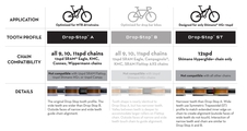 Vhodné pre sady 1x9 (v tomto prípade odporúčame používať s užšou 10-rýchlostnou reťazou pre pevnejšie spojenie s prevodníkom), 1x10 , 1x11 a 1x12. K dispozícii v dvoch zubových profiloch v závislosti od použitej sady Sram x Shimano, pozri tabuľku.