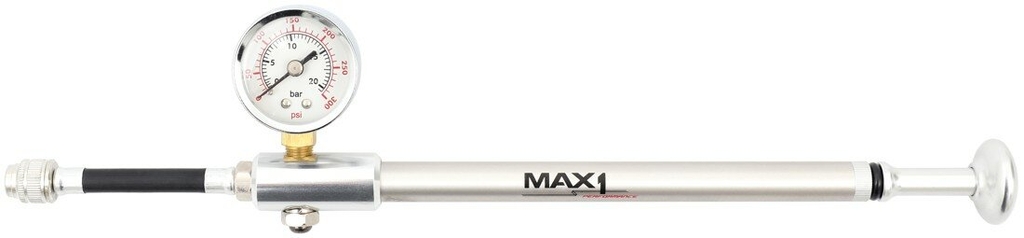 Nafukovačka MAX1 na nafukovanie tlmičov a odpružených vidlíc. Veľmi pohodlná manipulácia vďaka ergonomickej rukoväti.Nafukovačka je vybavená uvoľňovacím ventilom, vďaka ktorému môžete veľmi citlivo nastaviť požadované tlaky vo vidlici a tlmiči.