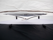 - Stan má odklápacie spálne a vrchný plášť natiahnutý na laminátových nosných tyčiach, stan má tiež 2 kovové skladacie tyče na upevnenie striešky nad vchodom