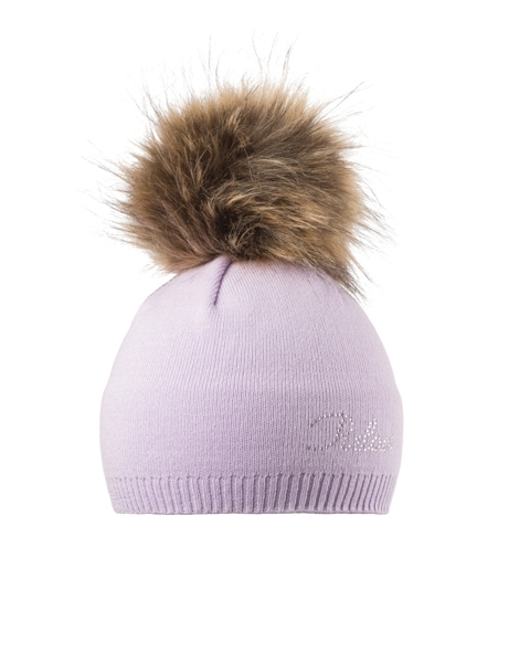 Dámska zimná čiapka v jednoduchom vzore s krásnymi trblietavými kamienkami na logu, s bambulou.